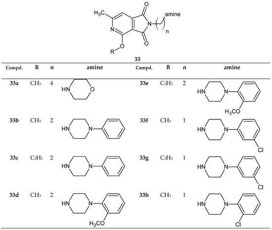 As mentioned in the previous section, compounds 33a–33h (Figure 27) presented interesting antinociceptive activity in addition to the strong sedative activity that has already been described [37]. Compounds 33a–33h (except 33c) were not toxic (LD50 >2000mg/kg). The analgesic activity of new compounds was studied using the hot-plate test and the writhing test. All tested 3,4-pyridinedicarboximide 33a–33h were active in the writhing test (ED50 = 3.25–19.2 mg/kg), and their analgesic activities in this study exceeded the effect of the reference ASA (ED50 = 39.15 mg/kg). In addition, the pharmacological activity of the two imides 33b (ED50 = 3.25 mg/kg and 33d (ED50 = 3.67mg/kg) was comparable to that of morphine used as a second reference drug (ED50 = 2.44 mg/kg). However, in the case of the hot-plate test, the analgesic effects observed for the tested structures did not reach statistical significance [37].