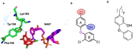 Interestingly, the X-ray crystallography work (PDB:1P45) conducted by Kuo et al. [] revealed the presence of two TCS molecules within the InhA active site. This was unique to Mycobacterial InhA and not found in the crystal structures of enoyl reductases from any other organisms solved to date. This occurrence was presumably due to InhA having a longer substrate binding loop to accommodate a larger substrate. One molecule occupies the same space and is in the same orientation as that of all the other TCS-ENR complexes. The second TCS molecule lies adjacent to the first, with its A- and B-rings aligned with those of the first TCS, engaging the substrate binding loop and promoting loop ordering (Figure 2) [].