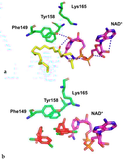 - Parikh, S.; Moynihan, D.P.; Xiao, G.; Tonge, P.J. Roles of tyrosine 158 and lysine 165 in the catalytic mechanism of InhA, the enoyl-ACP reductase from Mycobacterium tuberculosis. Biochemistry 1999, 38, 13623–13634. [Google Scholar] [CrossRef]