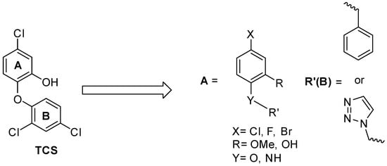 - Vosatka, R.; Kratky, M.; Vinsova, J. Triclosan and its derivatives as antimycobacterial active agents. Eur. J. Pharm. Sci. 2018, 114, 318–331. [Google Scholar] [CrossRef] [PubMed]