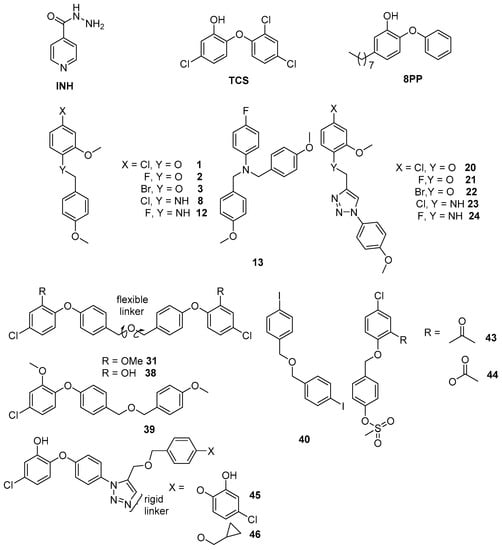 - Freundlich, J.S.; Wang, F.; Vilcheze, C.; Gulten, G.; Langley, R.; Schiehser, G.A. Triclosan derivatives: Towards potent inhibitors of drug-sensitive and drug-resistant Mycobacterium tuberculosis. ChemMedChem 2009, 4, 241–248. [Google Scholar] [CrossRef]
