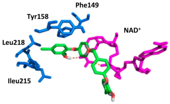 The docking data for the hydroxylated di-triclosan derivative 38 correlated well with the inhibition data. Compound 38 displayed 100% inhibition at just 50 µM and the docked structure predicts a hydrogen bond as well as a л-л stacking with the cofactor. An additional л-л stacking interaction was predicted to occur with Phe 149 as well as favourable van der Waals interactions with residues Leu 218 and Ile 215 (Figure 5).