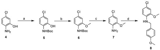 Synthesis of the chlorinated N-benzylphenyl aniline derivative 8. Reagents and conditions: (a) Boc2O, NaHCO3, H2O, 0 °C to r.t., 56%; (b) MeI, K2CO3, acetone, 60 °C, 6.5 h, 82%; (c) TFA, DCM, 0 °C to r.t., 2 h, 85%; (d) PMBCl, NEt3, DCM, 0 °C to r.t., 5.5 h, 12%.