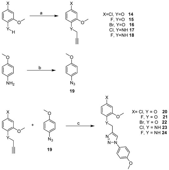 The next set of target compounds (triazole-linked diaryl target molecules) was synthesised using a CuAAC ‘click’ chemistry strategy, as shown in Scheme 4. The triazole-linked target molecules were synthesised by subjecting the respective aniline or phenol to a nucleophilic substitution with propargyl bromide to generate the terminal alkynes: 14–18. The azide 19 was formed by diazotisation of the commercially available aniline, followed by the CuAAC to generate the target molecules 20 (74%), 21 (77%), 22 (83%), 23 (84%), 24 (77%), respectively, in excellent yields.