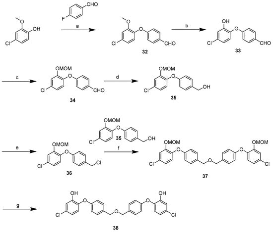 Synthesis of di-triclosan derivative 38. Reagents and conditions: (a) K2CO3, DMF, 130 °C, 18 h, 89%, (b) AcOH, 47% HBraq, 110 °C, 18 h, 29%, (c) DIPEA, MOMCl, r.t., 18 h, 92%, (d) NaBH4, MeOH, 0 °C to r.t., 4 h, 86%, (e) Et3N, MsCl, 0 °C to rt, 4 h, 56%, (f) NaH, DMF, 0 °C, 1 h, 45%, (g) 6 M HCl, MeOH, 70 °C 2 h, 44%.
