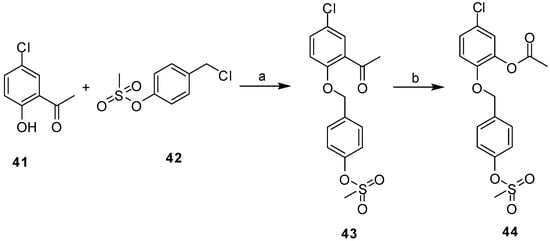 The dibenzylether 40 was obtained in two steps from iodobenzoic acid by reduction with BH3 followed by an SN1 reaction with 4-iodobenzyl bromide to give 40 in 71% yield. This intermediate was produced en route to finding a suitable method to generate the di-triclosan derivatives. We thought it might be useful to test against Mtb. This compound has been previously synthesized for other purposes []. Ketone 41 was subjected to a nucleophilic substitution reaction followed by a Baeyer-Villiger oxidation which converted the ketone 43 to an ester 44 (Scheme 8).