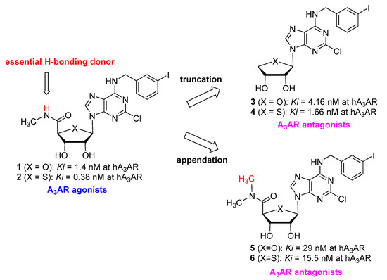 In the past decades, a variety of approaches have been followed to discover novel drug candidates targeting A3AR. 2-Chloro-N6-(3-iodobenzyl)adenosine-5′-N-methyluronamide (Cl-IB-MECA, 1) and its 4′-thio analogue 2 were discovered as potent and selective A3AR agonists from the extensive structure-activity relationships based on the structure of adenosine [13] (Figure 1). The 5′-uronamide hydrogen of 1, required for full agonism, forms a putative hydrogen bond with T94 (3.36) at hA3AR as modeled, suggesting that this interaction is essential for receptor activation by adenosine agonists [14]. Consistent with these findings, the 4′-truncated analogues, such as 3 and 4, lacking this hydrogen bond donor were discovered to act as A3AR antagonists or low-efficacy agonists, demonstrating that a hydrogen bond donating ability of the 5′-uronamide promotes A3AR activation [15,16]. The removal of the hydrogen bond donor ability by appending another methyl group to the 5′-uronamide, e.g., 5′-N,N-dimethyluronamide derivatives 5 and 6, similarly reduced A3AR efficacy. These compounds were characterized as potent and selective A3AR antagonists [17,18].