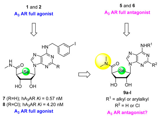 On the basis of a bioisosteric rationale, we recently reported that 4′-seleno analogues of 1 and 2, i.e., 7 and 8, were discovered as potent and selective hA3AR agonists [19] (Figure 2). They exhibited comparable A3AR binding affinity as the corresponding 4′-oxo- and 5′-thio nucleosides 1 and 2. However, X-ray analysis indicated that in the pure crystalline state they preferred a syn nucleobase orientation and a South sugar conformation, unlike 1 and 2. As mentioned above, removal of the amide hydrogen of the 5′-uronamide of 1 and 2 by N-methylation, resulting in 5 and 6 successfully converted A3AR agonists into A3AR antagonists. Based on these findings, we hypothesized that the 4′-seleno analogue of 5 or 6, bearing a 5′-N,N-dimethyluronamide moiety might be an A3AR antagonist (Figure 2). Thus, we analyzed the structure-activity relationship as A3AR ligands of this series by modifying N6- and C2 positions, by synthesizing novel 4′-selenonucleosides 9a–l. Herein, we report the synthesis and biological evaluation of 2,6-disubstituted-4′-selenoadenosine-5′-N,N-dimethyluronamide derivatives 9a–l as potent and selective A3AR a3ntagonists.