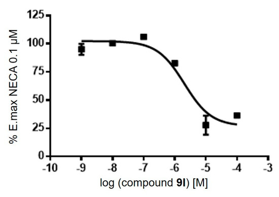 Concentration−response curve of 9l in a functional assay at human A3AR measuring inhibition of 10 μM NECA-induced cAMP accumulation. Points represent mean ± SD (vertical bars) of duplicate experiments.