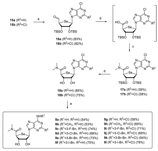 For the synthesis of final compounds 9a–l, key intermediates, 4′-seleno purine nucleosides 15a–b were synthesized from D-ribose following the previously reported procedures [18,19] (Scheme 1). Briefly, D-ribose was converted to L-lyxonolactone derivative 10 in three steps (oxidation to lactone, conversion of D-ribo configuration to L-lyxo configuration, and tert-butyldiphenylsililyl (TBDPS) protection). Reduction of 10 with NaBH4, ring cyclization of resulting diol with selenide ion, and a Pummerer rearrangement of 4-seleno sugar afforded the glycosyl donor 11. A Vorbrüggen condensation of 11 with 6-chloropurine and 2,6-dichloropurine produced the N9-β-anomers 12a and 13a with concomitant formation of their corresponding N7-β-anomers 12b and 13b, respectively. Conversion of N7 isomers 12b and 13b to their corresponding N9 isomers 12a and 13a was achieved by using TMSOTf at high temperature. Removal of the TBDPS group of 12a and 13a yielded the 5′-CH2OH derivatives 14a and 14b, respectively. Conversion of the 5′-hydroxymethyl group of 14a and 14b into a 5′-N,N-dimethyluronamide was successfully achieved, but the final deprotection of the acetonide group under strongly acidic conditions resulted in decomposition, instead of giving the desired final products. Thus, we exchanged the acetonide protecting group of 14a and 14b with a TBS group in four steps, giving 15a and 15b, respectively. Firstly, a PNB protecting group was attached to the 5′-position of 14a and 14b, followed by acetonide group deprotection with 50% aqueous TFA to give diols. The diols were then protected with a TBS group using TBSOTf followed by deprotection of the PNB group with sodium hydroxide in 1,4-dioxane to give 15a and 15b, respectively. The final deprotection with sodium hydroxide required mild reaction conditions (room temperature, overnight) because of the possible hydrolytic conversion of 6-chloropurine to hypoxanthine.