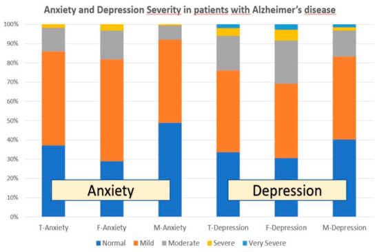 Anxiety and depression in patients with AD. T: Total sample; F: Females; M: Males.