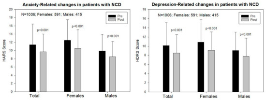 The baseline Hamilton Anxiety Rating Scale (HARS) score was 11.44 ± 5.41 in the total sample, 12.49 ± 5.63 in females, and 9.94 ± 4.69 in males (p < 0.001); and a significant improvement was observed following one month of multifactorial treatment in both sexes (T: 9.79 ± 4.33, p < 0.001; F: 10.53 ± 4.55, p < 0.001; M: 8.52 ± 3.70, p < 0.001) (Figure 2 and Figure 3).
