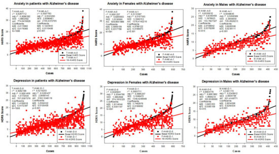 Mood disorders in dementia are the result of a number of factors, either endogenous or exogenous. Our study clearly shows substantial sex-related differences in the frequency and intensity of anxiety and depression in AD patients (Table 2 and Table 3; Figure 1 and Figure 3), as well as striking differences in anthropometric, biochemical, hematological, metabolic, and psychometric parameters between both sexes (Table 1, Table 2 and Table 3) that directly and/or indirectly may affect cognition and emotional status. Although mood disorders appear to be an intrinsic component of the dementia behavioral phenotype, in our sample of well-characterized patients, with a clinical follow-up for two decades, the improvement observed in both anxiety and depression cannot be exclusively attributed to psychotropic treatment, but also to the multifactorial intervention, covering concomitant problems, which were present in over 60% of the patients. Mood disorders in our sample appear to be unrelated to cardiovascular factors; and, apparently, both anxiety and depression present with greater frequency, with higher intensity, in females with lower red blood cell parameters and poorer metabolic conditions. Mood disorders are also unrelated to hyperglycemia in dementia (Table 1).