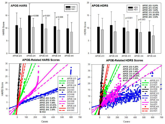 APOE-E. The distribution and frequency of APOE genotypes were the following: APOE-2/2 0.20%, APOE-2/3 8.54%, APOE-2/4 1.44%, APOE-3/3 61.83%, APOE-3/4 24.49%, and APOE-4/4 3.50% (Table 2 and Table 3). Baseline values of anxiety (HARS-0) were significantly different between APOE-2/3 and 2/4 (p < 0.007); APOE-2/4 vs. 3/3 (p < 0.01), vs. 3/4 (p < 0.002), and vs. 4/4 (p < 0.001); and APOE-3/3 vs. 3/4 (p < 0.005) and vs. 4/4 (p < 0.02) (Table 2; Figure 4). Improvement in anxiety symptoms was observed in most APOE variants; however, the best responders to multifactorial intervention were APOE-3/3 (p < 0.001), APOE-3/4 (p < 0.001), and APOE-2/4 carriers (p < 0.006) (Table 2; Figure 4). Baseline HDRS values for depression were significantly different between APOE-2/3 and 3/4 (p < 0.05) and 2/3 vs. 4/4 (p < 0.05); and also between APOE-2/4 and 4/4 (p < 0.05) and between APOE-3/3 and 4/4 (p < 0.05) (Table 3; Figure 4). The best responders to treatment were APOE-3/3 (p < 0.001) and APOE-3/4 carriers (p < 0.003) (Table 3; Figure 4).