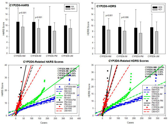 CYP2D6. The most frequent CYP2D6 variants in our population were CYP2D6*1A (PV00126)(wild type), *3A (PV00221)(2550delA)(rs35742686), *4 (PV00235)(1847G > A)(rs3892097), *5 (PV00259)(gene deletion), *6A (PV00198)(1708delT)(rs5030655), *41 (PV00239)(2989G > A)(rs28371725), and *1 × N (gene duplication, multiplication). Major genotypes included CYP2D6*1A/*1A, *1A/*3A, *1A/*4A, *1A/*5, *1A/*6A, *1A/*41, *3A/*3A, *3A/*4A, *3A/*6A, *4A/*4A, *4A/*5, *4A/*6A, *4A/*41, *5/*5, *5/*6A, *41/*41, *1A/*1 × N, *3A/*1 × N, *4A/*1 × N, *5/*1 × N, and *41/*1 × N, conferring the condition of normal metabolizer (NM) (57.74%), intermediate metabolizer (IM) (30.64%), poor metabolizer (PM) (5.56%), and ultra-rapid metabolizer (UM) (6.06%) phenotypes. Baseline HARS scores were similar among CYP2D6 geno-phenotypes, except between CYP2D6-NM and PM (p < 0.03) and between CYP2D6-IM and PM (p < 0.05). All CYP2D6 geno-phenotypes responded similarly to treatment; however, the best responders were CYP2D6-NM (p < 0.001) and IM (p < 0.001) (Table 2; Figure 5). Baseline HDRS scores did not show any difference among CYP2D6 geno-phenotypes. Although all variants improved with treatment, only CYP2D6-NM and IM showed significant differences as compared with basal HDRS score values, following a similar yet more modest pattern to that observed for anxiety (Table 3; Figure 5).