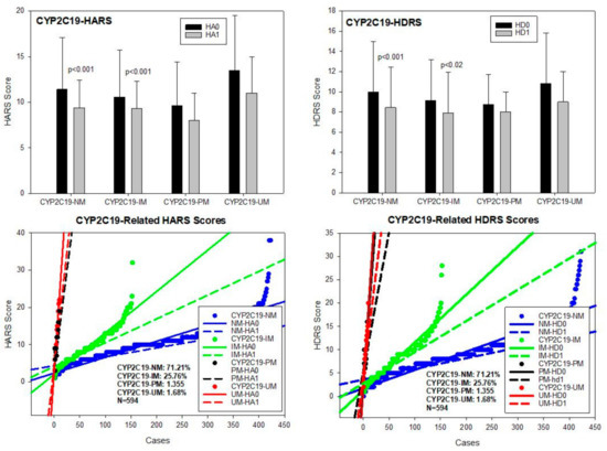 CYP2C19. The CYP2C19 gene exhibits 541 allelic variants among which the most important alleles were CYP2C19*1A (wild type) (PV00081), 2C19*2A (19154G > A) (PV00111) (rs4244285), and 2C19*17 (−806C > T) (PV00097) (rs12248560). In our sample, the most prevalent geno-phenotypes were CYP2C19*1A/*1A-EM and *2A/*17*-EM (71.21%), *1A/*2A-IM (25.76%), *2A/*2A-PM (1.35%), and *1A/*17-UM and *17/*17-UM (1.68%) (Table 2; Figure 6). No differences have been found among baseline HARS scores for anxiety, and only CYP2C19-NM (p < 0.001) and IM (p < 0.01) significantly responded to treatment. CYP2C19-PM and UM showed a mild, non-significant improvement in anxiety symptoms (Table 2; Figure 6). Basal HDRS scores showed differences between CYP2C19-NM and IM (p < 0.05) and between CYP2C19-NM and PM (p < 0.05). Improvement in depression HDRS scores were observed in CYP2C19-NM (p < 0.001) and IM (p < 0.02), with no response in CYP2C19-PM and minimum improvement in CYP2C19-UM (Table 3; Figure 6).