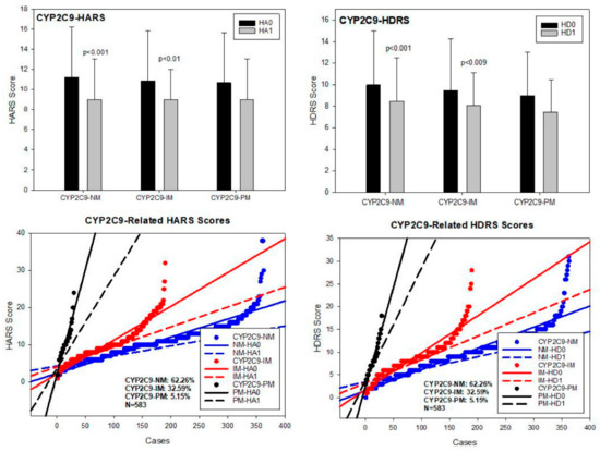 CYP2C9. Among the 480 allelic variants identified in the CYP2C9 gene, the most relevant alleles were 2C9*1A (wild type) (PV00030), 2C9*2A (3608C > T) (PV00044) (rs1799853), 2C9*3A (47639A > C) (PV00058)(rs1057910), and 2C9*5A (476aaC > G)(PV00025) (rs28371686). Major CYP2C9 geno-phenotypes in our sample were CYP2C9*1A/*1A-EM (62.26%), *1A/*2A-IM and *1A/*3A-IM (32.59%), and *2A/*2A-PM, *2A/*3A-PM and *3A/*3A-PM (5.15%) (Table 2; Figure 7). No differences in either basal HARS and HDRS scores were found. Both CYP2C9-NM and IM responded to treatment with a significant improvement in anxiety and depression symptoms (p < 0.001), and CYP2C9-PM experienced a mild, non-significant improvement in both depression and anxiety HDRS and HARS scores, respectively (Table 3; Figure 7).