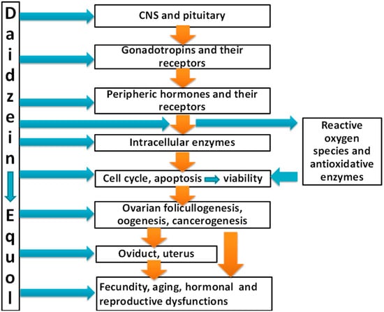 Female reproductive functions, like other functions, are controlled by a hierarchical system of exogenous and endogenous regulators—regulatory molecules produced in the hypothalamus and other areas of the central nervous system (CNS), pituitary hormones (mainly gonadotropins), hormones produced by the ovaries and other peripheral organs, receptors to hormones, and intracellular mediators of their action—and enzymes including protein kinases, transcription factors regulating cell proliferation, apoptosis, viability, and differentiation [34]. The influence of daidzein on some (but not all) of these regulatory molecules is documented.