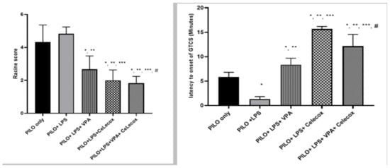 Effects of test drugs on Racine score and latency to Generalized Tonic-Clonic Seizure (GTCS) onset in rats subjected to Pilocarpine. Data were expressed as mean +/− standard deviation. PILO: pilocarpine, LPS: lipopolysaccharides; VPA: Valproic acid, Celecox: celecoxib. Comparison between groups was made using One-way ANOVA test followed by Tukey’s multiple comparison test. * p < 0.05 comparison versus PILO only; ** p < 0.05 comparison versus PILO+LPS, *** p < 0.05 comparison versus PILO +LPS+VPA, # p < 0.05 comparison versus PILO+LPS+Celecox.