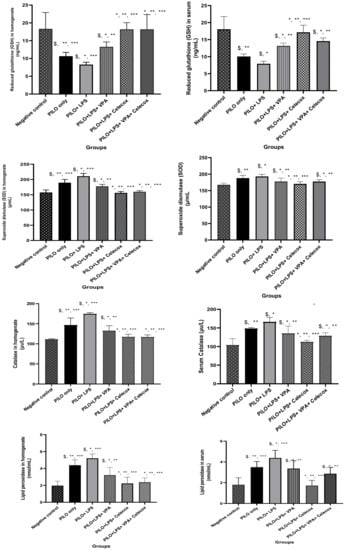 The PILO and PILO+LPS group exhibited a significant reduction in glutathione (GSH) and superoxide dismutase (SOD) serum levels versus negative control rats (p < 0.05) and in the PILO+LPS group versus PILO (p < 0.05). GSH and SOD serum levels showed a significant increase in PILO+LPS+VPA, PILO+LPS+Celecox, and PILO+LPS+VPA+Celecox versus PILO and PILO+LPS groups (p < 0.05). Furthermore, GSH and SOD showed significant increase in PILO+LPS+Celecox versus the PILO+LPS+VPA group (p < 0.05). Catalase and lipid peroxidation serum levels exhibited a significant increase in PILO and PILO+LPS group versus negative control rats (p < 0.05) and in the PILO+LPS group versus PILO (p < 0.05). Catalase and LPO serum levels were significantly decreased in PILO+LPS+VPA, PILO+LPS+Celecox, and PILO+LPS+VPA+Celecox versus PILO and PILO+LPS groups (p < 0.05). Furthermore, there was a significant decrease in PILO+LPS+Celecox versus the PILO+LPS+VPA group (p < 0.05). In the PILO+LPS+VPA+Celecox group, serum levels of GSH, catalase, and LPO were significantly decreased while SOD was significantly increased versus PILO+LPS+Celecox (p < 0.05). The same changes were noticed in hippocampus homogenate levels (Figure 2).