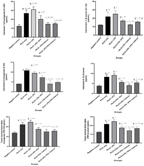 Effects of tested drugs on serum and homogenate levels of pro-inflammatory cytokines in rats of different groups. Data were expressed as mean +/− standard deviation. PILO: pilocarpine, LPS: lipopolysaccharides; VPA: valproic acid, Celecoxib: celecoxib. Comparison between groups was made using One-way ANOVA test followed by Tukey’s multiple comparison test. * p < 0.05 comparison versus PILO only; ** p < 0.05 comparison versus PILO+LPS, *** p < 0.05 comparison versus PILO+LPS+VPA, # p < 0.05 comparison versus PILO+LPS+Celecoxib, $ p < 0.05 comparison versus negative control group.