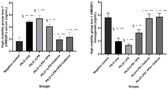 Effects of test drugs on high mobility group box-1 (HMGB1) levels in the serum and homogenate in rats of different groups. Data were expressed as mean +/− standard deviation. PILO: pilocarpine, LPS: lipopolysaccharides; VPA: valproic acid, Celecoxib: celecoxib. Comparison between groups was made using One-way ANOVA test followed by Tukey’s multiple comparison test. * p < 0.05 comparison versus PILO only; ** p < 0.05 comparison versus PILO+LPS, *** p < 0.05 comparison versus PILO+LPS+VPA, $ p < 0.05 comparison versus negative control group.
