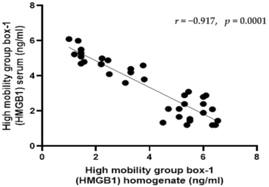 The serum level of HMGB1 exhibited significant negative correlation with HMGB1 homogenate level (r = −0.917, p < 0.001) (Figure 5).
