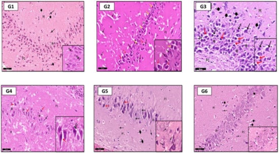 Photomicrographs of CA3 area of rat hippocampus shows: in control rats (G1), CA3 area consists of three layers; molecular (M), pyramidal (Pr), and polymorphic (P1) layers. The pyramidal cells are large neurons with rounded vesicular nuclei (↑), some of them are binucleated (inset—↑↑). Molecular layer (M) has a loose appearance with glial cells (head arrow) and interneurons (dot arrow). In (G2) (PILO rats), signs of degeneration were evident, especially in pyramidal layer in the form of shrunken pyramidal cells with pyknotic nuclei (yellow ↑) with wide perineuronal spaces (red ↑; some pyramidal cells have karyolitic nuclei (black ↑). Notice pale vacuolated areas (dot ↑) in molecular layer (M) and Polymorphic (P1) layer. In (G3) (PILO+LPS rats) higher degree of cellular degeneration was recorded with empty spaces (*), pyknotic nuclei (black ↑), shrunken neurons with perineuronal spaces (red ↑) within pyramidal layer (see also inset). Molecular layer (M) shows a marked enlargement of glial cells (head arrow). In (G4) (PILO+LPS+VPA rats), few shrunken pyramidal cells (black ↑) with perineuronal spaces (red ↑) within pyramidal layer (Pr); areas of pyramidal cells loss were localized (*). Inset: higher magnification of pyramidal cells. In (G5) (PILO+LPS+Celecoxib rats), moderate signs of improvement were recorded in most of pyramidal cells (black ↑); shrunken cells with perineuronal spaces (red ↑) were rare; glial cells (head arrow) and interneurons (dot ↑) in molecular (M) and polymorphic layers (P1). In (G6) (PILO+LPS+VPA+Celecoxib rats), cellular profile was nearly as in control rats, glial cells (head arrow), interneurons (dot ↑) and pyramidal cells appear with vesicular nuclei (↑). Insets are magnifications of pyramidal layer. Stain: H&E. Bar: 50 µm. Inset ×400.