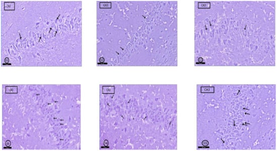 Photomicrographs of CA3 area of rat hippocampus proper: In control rats (G1), pyramidal cells showed heavily studded cytoplasm with Nissl granules (arrows). In (G2) (PILO rats) and (G3) (PILO+LPS rats), marked decrease in Nissl granules content was observed in pyramidal cells (arrows). On the other hand, Nissl granules were increased (arrows) mildly in (G4) (PILO+LPS+VPA rats), moderately in (G5) (PILO+LPS+Celecoxib rats) and markedly in (G6) (PILO+LPS+VPA+Celecoxib rats). Stain, toluidine blue. Bar 50 µm.