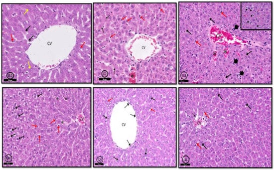 Photomicrographs of rat liver of different groups. In control rats (G1), normal hepatic profile contains hepatocytes arranged in cords around the central vein (CV), some hepatocytes are binucleated (black ↑); blood sinusoids (red ↑) and von Kupffer cells (yellow ↑). In (G2) (PILO rats), hepatic architecture was generally normal but few nuclei showed karyolysis (black ↑), congestion of some blood sinusoids (*), and few prominent von Kupffer cells (red ↑). In (G3) (PILO+LPS rats) and (G4) (PILO+LPS+VPA rats) hepatic tissue showed degenerated hepatocytes with pyknotic nuclei (black ↑), congested central vein (CV); focal aggregations of inflammatory cells (head arrow—inset) and increased von Kupffer cells (red ↑) in congested blood sinusoids (*). In (G5) (PLC+LPS+Celecoxib rats) and (G6) (PILO+LPS+VPA+Celecoxib rats), hepatic architecture was nearly normal showing polyhedral hepatocytes (black ↑), von Kupffer cells (red ↑) and newly formed hepatocytes (dot ↑). Stain; H&E. Bar 50 µm Inset ×400.