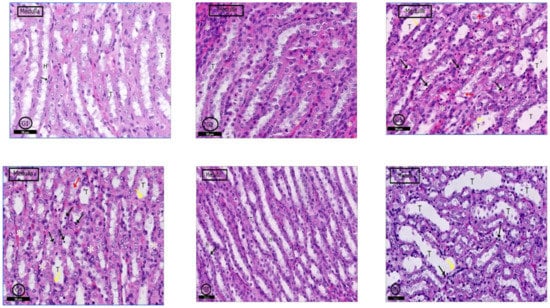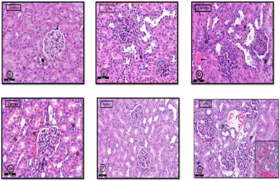 H&E stained sections of the kidney from control rats (G1) showed normal renal cortex containing the renal corpuscles, proximal convoluted tubules (PCTs), and (DCTs) distal convoluted tubules Figure 9G1). The renal cortex in G2 rats was similar to that in control rats; however, few glomeruli have hypertrophied glomerular capillary loops with dark nuclei, and interstitial inflammatory cells infiltration was evident; lumens of some PCTs were dilated (Figure 9G2). In G3 and G4 rats, a wide range of degeneration signs was apparent in the renal cortex in the form of sclerosed glomeruli, pyknotic nuclei with an absence of glomerular space. Marked inflammatory cell infiltration and exudate were apparent in the cortical stroma. Many DCTs showed dilated lumens (Figure 9G3,G4). In G5 and G6 rats, marked improvement in the histological profile of the renal cortex was detected; however, some glomeruli in G6 rats showed obliterated capillaries, stromal inflammatory cells infiltration focal interstitial hemorrhages with exudate (Figure 9G5,G6).