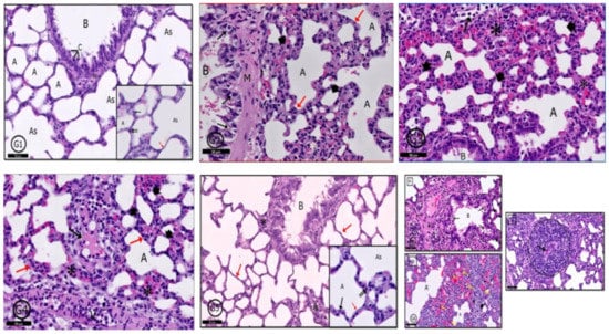In control rats (G1), a typical pulmonary tissue profile was clear in the form of bronchioles, alveoli, alveolar sacs, and blood vessels. The alveolar epithelium was formed of; type I (flat) and type II pneumocytes (cuboidal) with rounded nuclei (Figure 11G1). In G2 rats, mild degenerative and inflammatory reactions were recorded in pulmonary tissues in the form of thickened interalveolar septa, widened emphysematous alveoli and extravasated red blood cells (RBCs) and inflammatory cells (Figure 11G2). In G3 and G4, a variety of degenerative changes were recorded in pulmonary tissues; some alveoli showed emphysema and others showed narrow lumens; interalveolar septa were markedly thickened; congested blood vessels; alveolar lumens and stroma contained inflammatory cells and extravasated RBCs beside stromal edema (Figure 11G3,G4). Examination of G5 showed marked improvement in tissue profile was recorded to be similar to that in control rats (Figure 11G5) but in G6, marked degenerative changes were clear as in G3 and G4, in addition to epithelioid granuloma, which appeared nearby bronchioles (Figure 11G6).