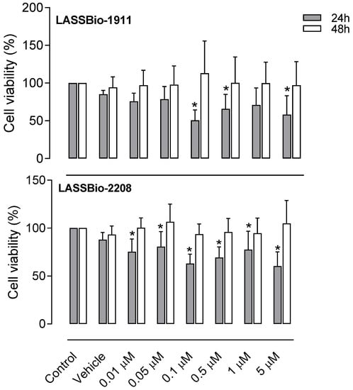 Cell viability was determined using 3-(4,5-dimethyl-2-thiazyl)-2,5-diphenyl-2H-tetrazolium bromide (MTT) reagent (Sigma-Aldrich, St. Louis, MO, USA) following the method described by Denizot and Lang [44]. Cells were plated at an initial density of 2.5 × 104 cells per well in 96-well plates and incubated for 24 h at 37 °C and 5% CO2. After 24 h, the cells were 70–80% confluent and were treated with LASSBio-1911 or LASSBio-2208 at a final concentration of 0.01 to 5 μM and further incubated for 24 or 48 h. The resulting formazan crystals were dissolved in DMSO (100 μL), and the absorbance intensity was measured in a FlexStation 3 microplate reader (Molecular Devices, San Jose, CA, USA) at a wavelength of 570 nm.
