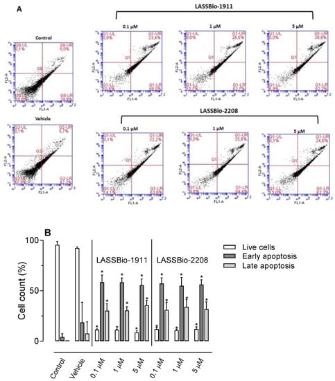 An apoptosis assay was carried out with an Annexin V kit (BD Biosciences, San Jose, CA, USA) by staining the cells according to the manufacturer’s protocol. Briefly, cells (2.5 × 105 cells) were seeded into 12-well plates and incubated with LASSBio-1911 or LASSBio-2208 at a concentration of 0.1, 1, or 5 μM for 24 h, harvested, washed with phosphate-buffered saline (PBS), and resuspended in the indicated binding buffer. Subsequently, Annexin V/FITC and propidium iodide (PI) were added to the cell suspension and incubated for 15 min in the dark at room temperature. After incubation, the samples were analyzed by flow cytometry (BD Accuri™ C6 Plus, BD Biosciences, San Jose, CA, USA), and the data were analyzed by BD CFlow Plus software (BD Biosciences, San Jose, CA, USA).