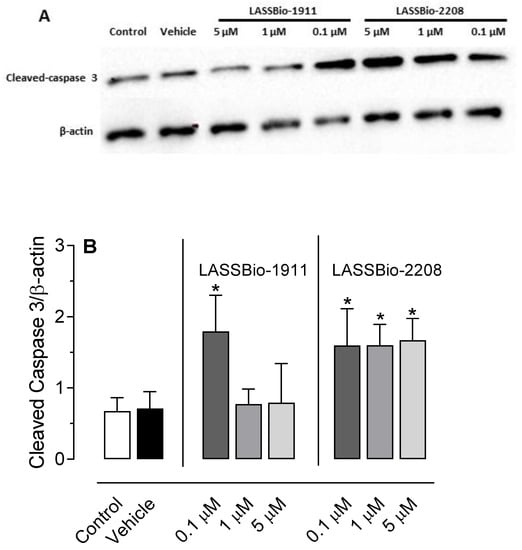 We next evaluated the effect of LASSBio-1911 and LASSBio-2208 against the expression of cleaved caspase 3 through Western blot analysis. The data shown in Figure 3 reveal that treatment with LASSBio-1911 (at 0.1 µM) and LASSBio-2208 (at all concentrations) significantly increased the activity of caspase after 24 h (Figure 3A,B). These results suggest that both compounds induced the apoptosis of PC3 cells.