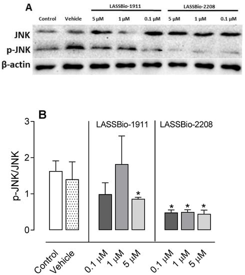 Effects of LASSBio-1911 and LASSBio-2208 on the phosphorylation of JNK in PC3 cells. Cells were treated with compounds (0.1, 1 and 5 μM) for 24 h. (A) show a representative Western blot of p-JNK, JNK and β-actin proteins. (B) shows the p-JNK/JNK ratio values. The data are presented as the mean ± standard error of three independent experiments. Statistical analysis was performed using GraphPad Prism 8.02 and one-way ANOVA followed by Dunnett´s post hoc test. Statistical significance was defined as * p < 0.05 compared with untreated cells (controls).