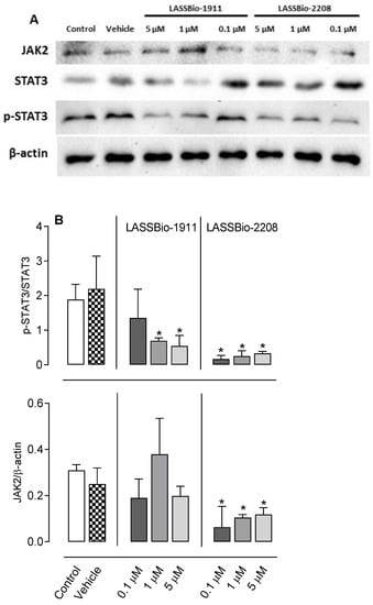 We performed Western blotting to analyze the expression of JAK2/STAT3 signaling pathway components. As shown in Figure 5, after 24 h of treatment, both compounds inhibited STAT3 phosphorylation in PC3 cells. LASSBio-1911 significantly inhibited STAT3 expression at concentrations of 1 and 5 µM, and LASSBio-2208 demonstrated an important effect, reducing STAT3 expression by almost 90% at all concentrations used. On the other hand, only the dual inhibitor LASSBio-2208 significantly reduced JAK2 expression after incubation at all three concentrations (0.1, 1 and 5 µM).