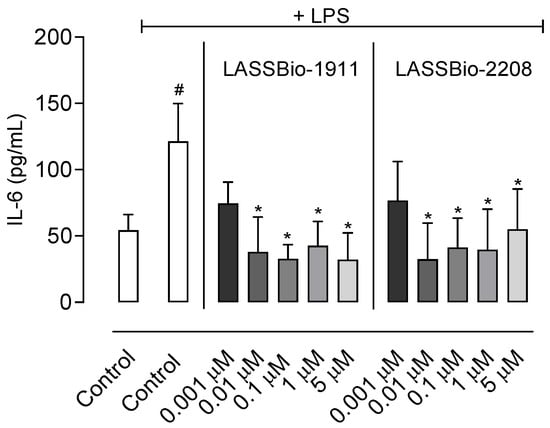 The effects of LASSBio-1911 and LASSBio-2208 on IL-6 production in PC3 cells. Cells were treated with LASSBio-1911 or LASSBio-2208 (0.001–5 μM) for 24 h. The results are expressed as the mean ± standard error of five independent experiments. Statistical analysis was performed using GraphPad Prism 8.02 and one-way ANOVA with Dunnett´s post-test, and statistical significance was defined as * p < 0.05 compared with the LPS-treated group. # p < 0.05 compared with the non-LPS treated group (control).