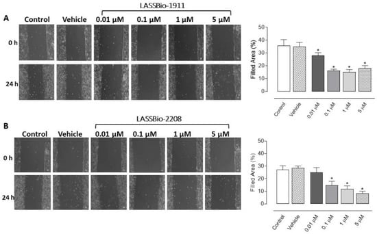 Cellular migration was evaluated by scratch assay according to our previous studies [45,46]. Cells were cultured in 12-well culture plates for 24 h and to 90–100% confluence. The cells were incubated for 24 h with LASSBio-1911 or LASSBio-2208 at final concentrations of 0.01–5 µM. All cell-based scratch assays were performed in the presence of the anti-mitotic reagent cytosine arabinoside (AraC; Sigma-Aldrich, St. Louis, MO, USA) at a final concentration of 10–5 M (to inhibit cell proliferation). After treatment with the compounds, the wound areas were observed, and images were acquired with an Evos M5000 (Invitrogen, Thermo Fischer Scientific Inc., Waltham, MA, EUA). The filled area was quantified using the Fiji software (ImageJ, National Institutes of Health, Bethesda, MD, USA).