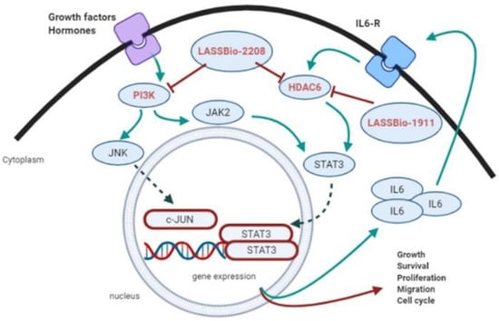 We analyzed the migration of PC3 cells based on the following considerations: IL-6 may promote the initial steps of prostate cancer metastasis by upregulating MMP-9 through the PI3K/Akt signaling pathway [41], the inhibition of JAK/STAT3 activity or the interception of microtubule assembly to suppress diffuse large B-cell lymphoma migration [42]; the downregulation of STAT3 can reverse the inhibited invasion and migration of oesophageal squamous cell carcinoma [43]; and our results indicated that LASSBio-1911 and LASSBio-2208 inhibit the IL-6/STAT3 signaling pathway. The data obtained showed that the inhibition of HDAC6/8 or the dual inhibition of PI3K/HDAC6 led to a reduction in the migration of PC3 cells, suggesting that both compounds have antimetastatic activity through the inhibition of the IL-6/STAT3 pathway.