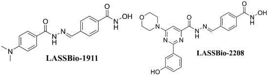 - Rodrigues, D.A.; Guerra, F.S.; Sagrillo, F.S.; de Sena, M.; Pinheiro, P.; Alves, M.A.; Thota, S.; Chaves, L.S.; Sant’Anna, C.M.R.; Fernandes, P.D.; et al. Design, synthesis, and pharmacological evaluation of first-in-class multitarget n-acylhydrazone derivatives as selective HDAC6/8 and PI3Kα inhibitors. ChemMedChem 2020, 15, 539–551. [Google Scholar] [CrossRef]