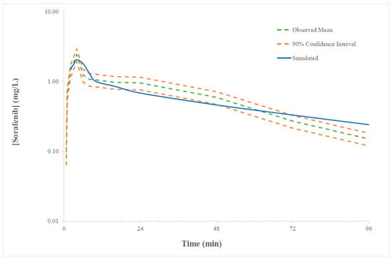 The sorafenib compound model was validated by comparing simulated AUC and Cmax values to reported observed values from matched clinical trials undertaken in cancer patients. A mean simulated parameter estimated within two-fold of the mean observed parameter and contained within the 90% confidence interval for the observed parameter was applied as the criteria to accept the model accuracy. The model goodness-of-fit was further verified by visual inspection of the overlay of mean simulated and observed sorafenib concentration-time profiles from individual clinical trials. Simulated Cmax values were normalised to account for the mean fold error (MFE) between simulated and observed values determined from multiple dose validation studies when evaluating simulations against the observed target concentration range (4.78 to 5.78 µg/mL).