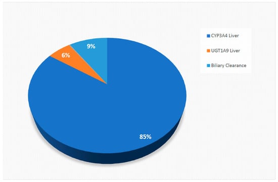 The physicochemical, blood binding, absorption, distribution, elimination parameters utilised to construct the sorafenib compound model are summarised in Table 4. Physicochemical properties were based on published literature and documents [,]. Metabolism and elimination parameters were incorporated based on reported intersystem extrapolation factor (ISEF) adjusted in vitro CYP and UDP-glucuronosyltransferase (UGT) data (Figure 4).