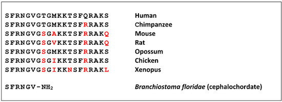 Neuropeptide S (NPS) or NPS-like peptide sequences. Residues divergent from the human NPS sequence are highlighted in red. The C-terminal amide (NH2) in the Branchiostoma peptide is encoded by glycine in the precursor protein and therefore identical to the consensus.