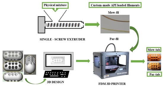 Manufacturing by FDM-3DP adapted for the pharmaceutical sector relies on active pharmaceutical ingredient (API) containing feedstock filaments that are melted and extruded throughout a heated nozzle, followed by layer-by-layer deposition of the material on a build plate, according to the preset digital model, until the final object is fabricated [6]. The initial attempts of adjusting the technology depended on commercially available filaments in which the drug was included through immersion into a solution of the API [7,8,9]. The method, however, presented drawbacks, such as achievement of low drug loading, requirement of supplementary processing steps, or reduced reproducibility, and the focus was relocated towards preparation of the drug containing filaments by Hot Melt Extrusion (HME). Throughout the HME operation, the materials are blended and heated in the extruder, the melted mass being subsequently pressed through a die in furtherance of filament shaping, through rapid solidification by cooling. The primary advantage of the methodology is achievement of high drug loading, as preparation of 3D printable filaments with a 50% w/w drug content was reported [10]. In addition, HME provides the opportunity to surpass the solubility issues of poorly soluble APIs through solid dispersion preparation, a system wherein the drug is molecularly disseminated into the carrier matrix [11]. However, according to recently published investigations, similar advantages could be obtained by employing a newly reported printing technique, namely direct powder extrusion 3D printing, which is a single-phase preparation method that eliminates the HME phase [12,13,14].