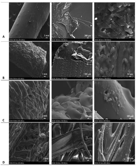 An important aspect to be taken into consideration regarding HME is the amount of time spent by the materials in the extruder, also known as residence time, as it has a significant influence on the stability of the substances, the polymorphic transformations and the aspect of the extrudates [31]. Important differences regarding the residence time of the two formulations occurred throughout the extrusion phase, taking into account that the interval of time measured from the moment of feeding the physical mixture into the apparatus to the filament discharge initiation was nearly 8 min, in the instance of Mow-mix, and less than 3 min for PAR-mix. The variation is assignable to the differences in terms of polymer particle size, as the reduced dimension of PAR particles ensured a more rapid melting of PAR-mix and, as a consequence, an accelerated initiation of discharge of the melted mass was achieved. Therefore, it is noticeable in Figure 1 that the obtained filaments, Mow-fil and Par-fil, exhibited aspect dissimilarities, a darker colored product being acquired in case of Mow-fil. Scanning electron microscopy (SEM) investigation of the prepared KET-loaded PVA-based filaments (Figure 2A,B) exposed compact HME products with a certain degree of surface roughness.