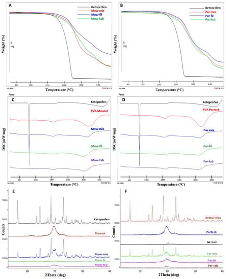 Differential scanning calorimetry (DSC) thermograms are presented in Figure 3C,D. Pure KET displays a melting endothermic peak at 94 °C, confirming the crystalline state of the API [45,46]. Thermograms of the two sorts of PVA displayed glass transition endotherms at 46 °C for MOW and 52 °C for PAR, while the Tm was depicted at 190 °C for each polymer. Analysis of the physical mixtures revealed the characteristic peaks of the components, confirming that the solid state of the materials was not modified by regular blending. The absence of the API’s melting endotherm in the filaments and 3DP tablets indicates the complete conversion of KET into an amorphous state, implying the formation of a one-phase system already in the HME step by processing the blends above the Tm of the drug which fuses with the carrier. The corresponding endotherm peaks representative for PVA were present in both filaments and tablets, regardless of the type of polymer used, the polymer maintaining its semi-crystalline state following thermal treatment.