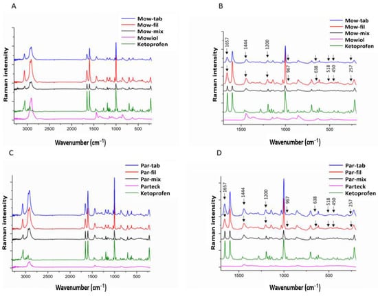 (A) Raman spectra of Mow, KET, and Mow-based formulations and (B) the magnification of fingerprint range spectrum; (C) Raman spectra of Par, KET, and Par-based formulations and (D) the magnification of fingerprint range spectrum.