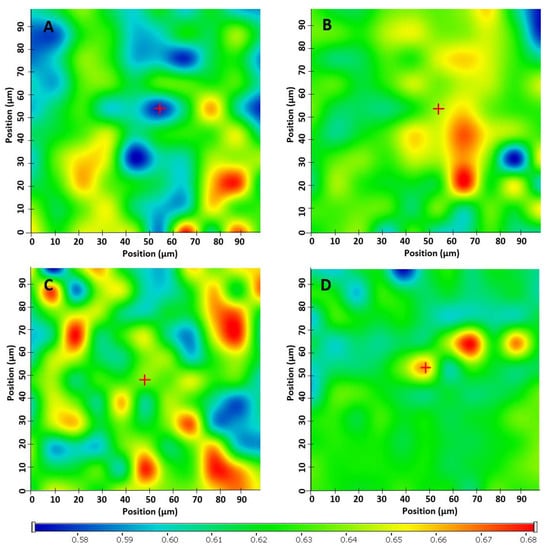 Raman mapping depictions of (A) Mow-fil, (B) Mow-tab, (C) Par-fil, (D) Par-tab.