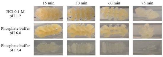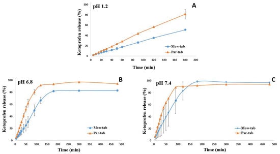 Previous investigation established that API release from the PVA matrix is controlled by erosion and diffusion processes [19,37]. As shown in Figure 6A, 35% of the drug was released from the Mow-tab into the hydrochloric acid media (pH 1.2) after 2 h, whereas 56% of the KET content was released by the Par-tab in the equivalent time frame. The dissolution profiles of the 3DP dosage forms in pH 6.8 phosphate buffer are presented in Figure 6B and it may be noted that the Mow-tab reached 67% drug release in 2 h, while in comparison the Par-tab reached over 90% release in 2 h. A similar trend was obtained in pH 7.4 dissolution media (Figure 6C) with the remark that in the instance of Mow-tab the plateau was attained in 3 h with complete drug release (100%), while the Par-tab achieved comprehensive dissolution after 90 min (~90%). The KET release profile kinetics were assessed by fitting the results to six mathematical models (zero-order, first-order, Higuchi, Baker and Lonsdale, Hixon and Crowell, and Peppas) and a good correlation and model prediction was found with a zero-order release profile in 0.1 M hydrochloric acid medium and Hixon and Crowell release profile in phosphate buffer media. The selected model drug is a weak acidic substance with pH-dependent solubility, and it is also observable that the release rate of the API is highly dependent on the pH of the media, as slower dissolution (Figure 6) and erosion of the tablets is noticeable in the acidic media (Figure 7).